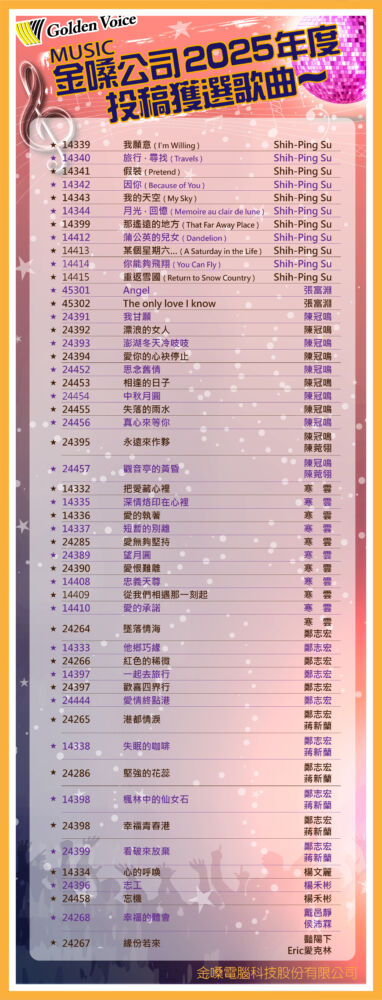 【2025年度 金嗓公司投稿獲選歌曲】 2026-01-05 最新消息 【2025年度 金嗓公司投稿獲選歌曲】謝謝大家持續踴躍報名原創歌曲投稿讓更多人有機會欣賞到優質音樂作品😍想要推廣你的才華讓更多人看見嗎? 投稿傳送門