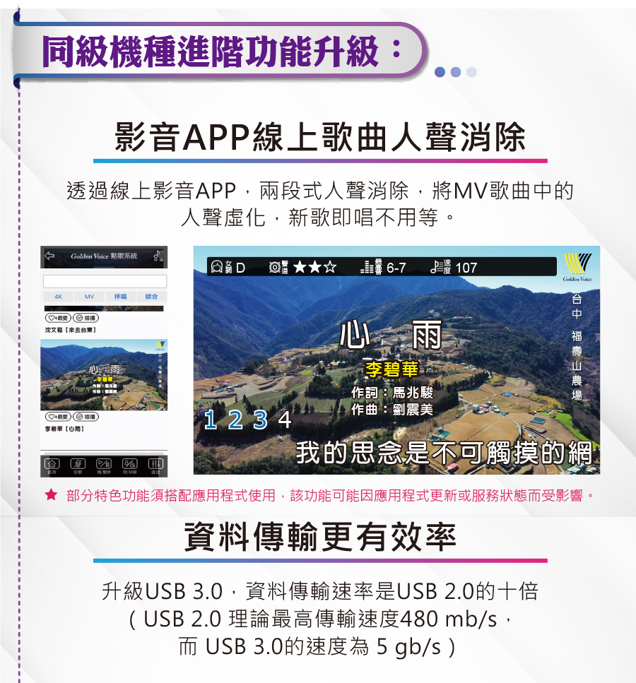 CPX-900 K2F家庭劇院型伴唱機NT$37,000 盡情歡唱,暢享生活! 分類: 家庭劇院型 描述 規格 檔案下載 描述 規格 項目 CPX-900 K2F 主機尺寸 長438mm寬334mm(含I/O)高94mm(含腳墊) 顏色 黑色 主機重量 4.13Kg(不含HDD) 電源 DC12V/5.0A(Adapter 110~240VAC) 功率消耗 待機功率小於2W 運作中最大消耗功率小於55W 檔案下載 CPX-900 K2F DM正面 1 file(s) 407.71 KB 下載 CPX-900 K2F DM背面 1 file(s) 476.11 KB 下載 CPX-900 K2F說明書 1 file(s) 3.62 MB 下載