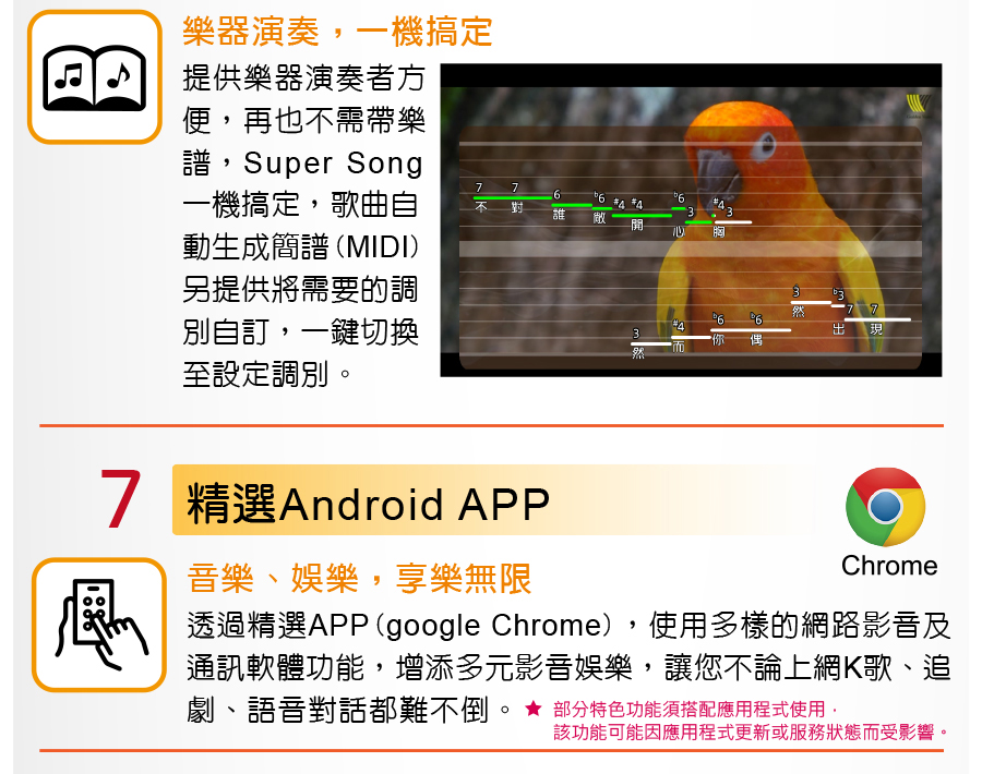 | 功能類型 | Android安卓系統, HDMI 1080, Qrcode點歌, Wi-Fi上網, 我的最愛存取, 手機APP智慧神控點歌, 簡譜功能, 語音聲控點歌, 錄音功能 |